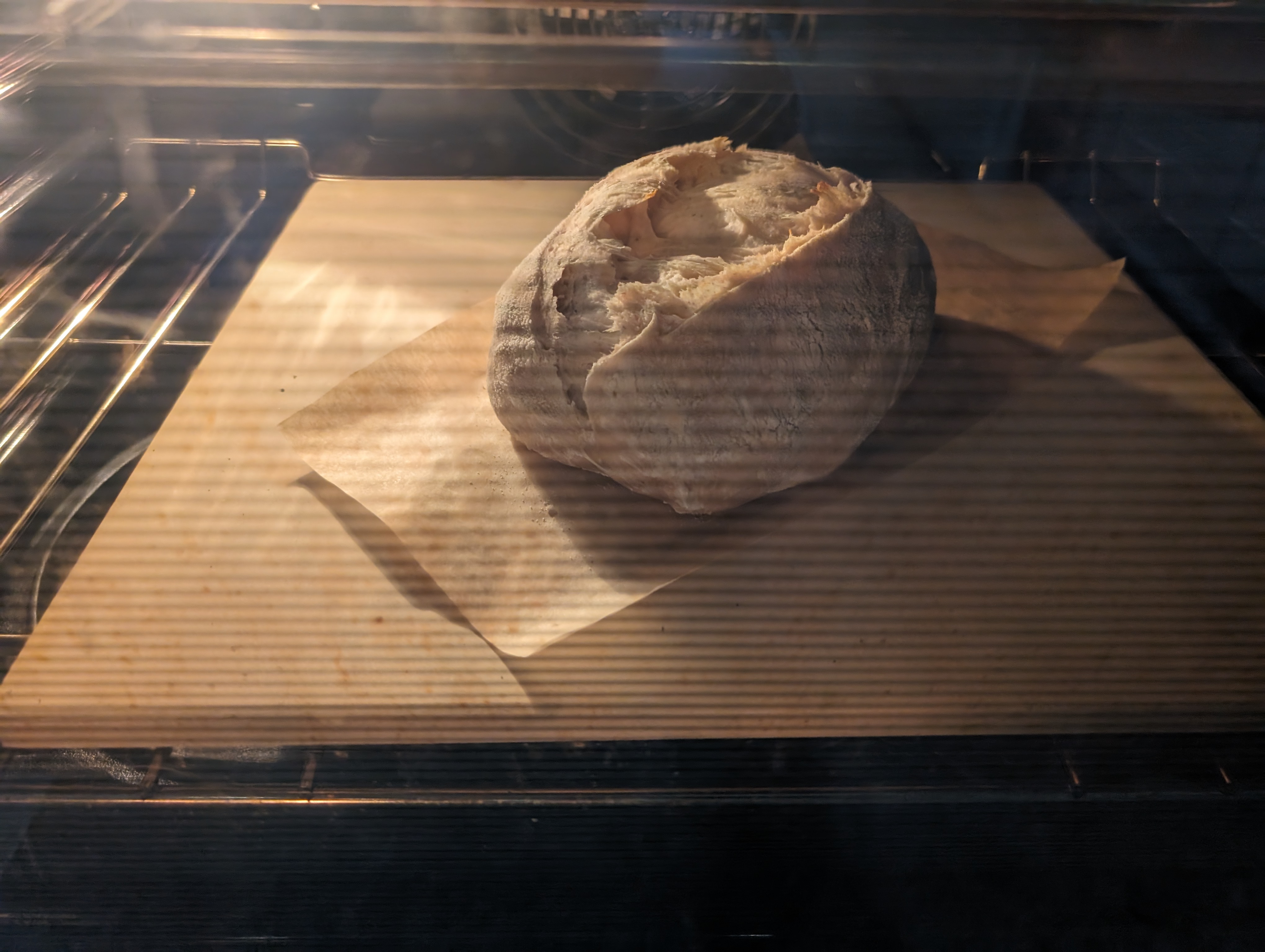 - Again, baked for 20 mins w/steam, 28 minutes without. Put on parchment on a baking stone.