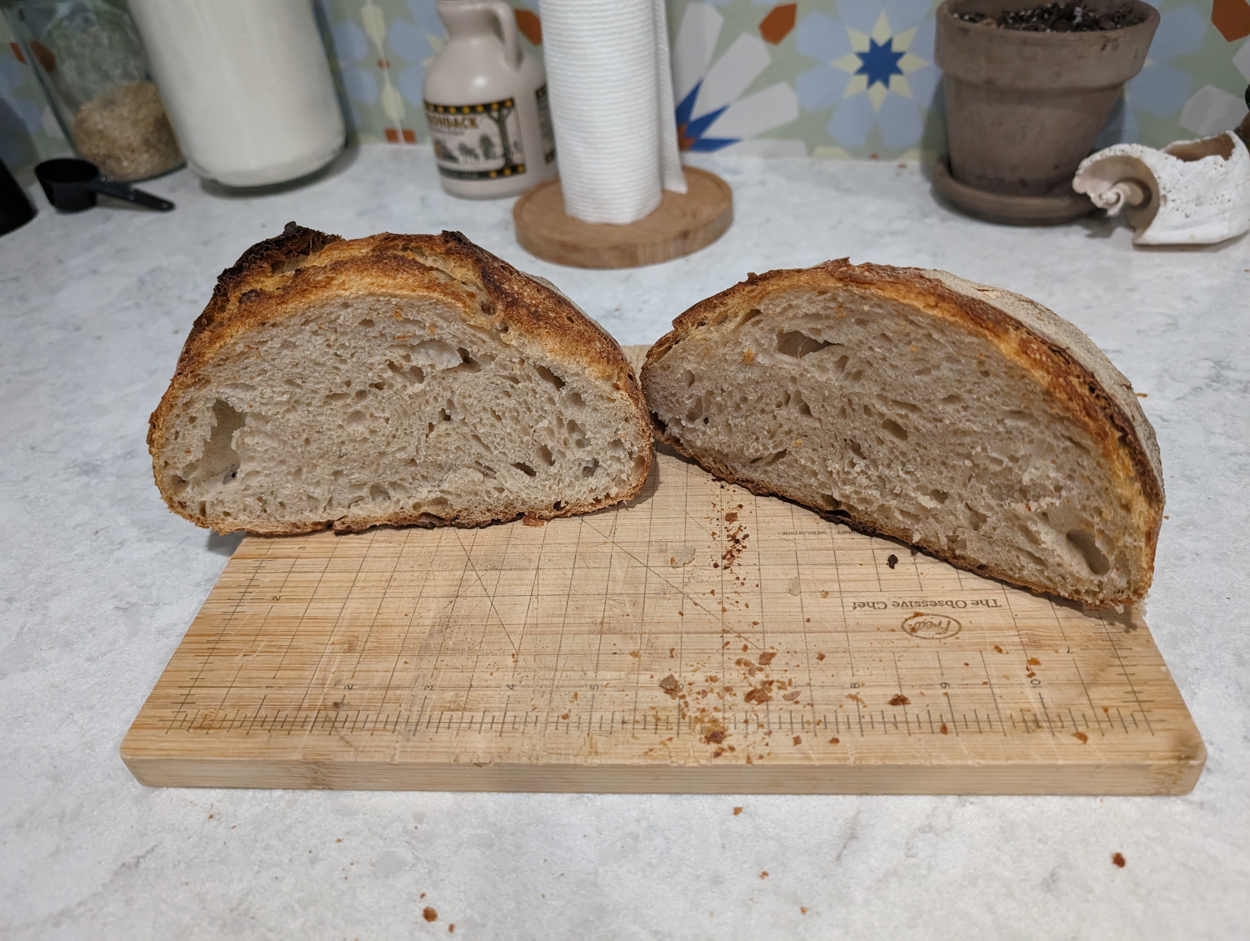 - 9pm - cut. Not bad! Better crumb than last time, no gummy bits. Cooled for ~2+ hours.